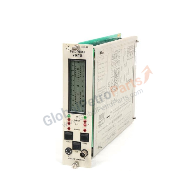 The Bently Nevada 3300/20-13-03-01-00-00 is a Dual Thrust Monitor from the 3300 series, designed for continuous axial position tracking of rotating machinery. It works with Bently Nevada Proximity Probes, provides three relays for alert and danger protection, and includes a recorder output for data acquisition integration.